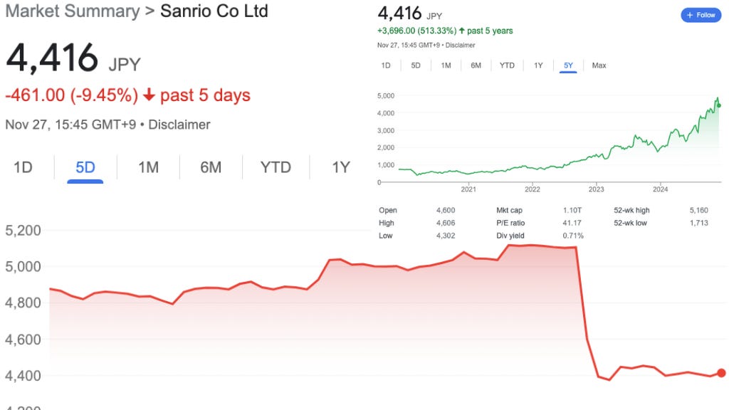 Of course, this transformation hasn’t been without hiccups. Mitsubishi UFJ Financial Group's recent sell-off of Sanrio shares, which triggered a 17% drop in the company’s stock price, wasn’t exactly a victory lap. But in the context of Japan’s shifting corporate culture, it wasn’t a death knell either. The move signalled Sanrio’s commitment to shedding its image as a family-run relic and embracing a more globalized, shareholder-friendly future.